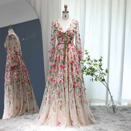 Luxury Embroidery Long Evening Dress Garden Floral Vintage Formal Prom Dress for Women