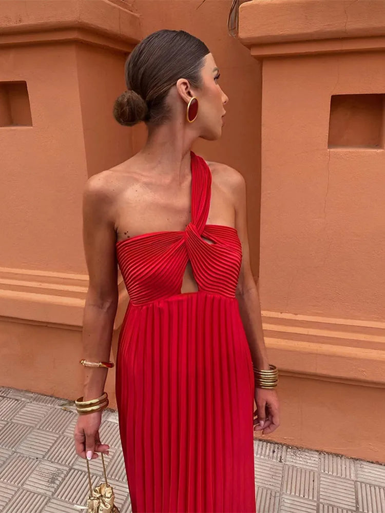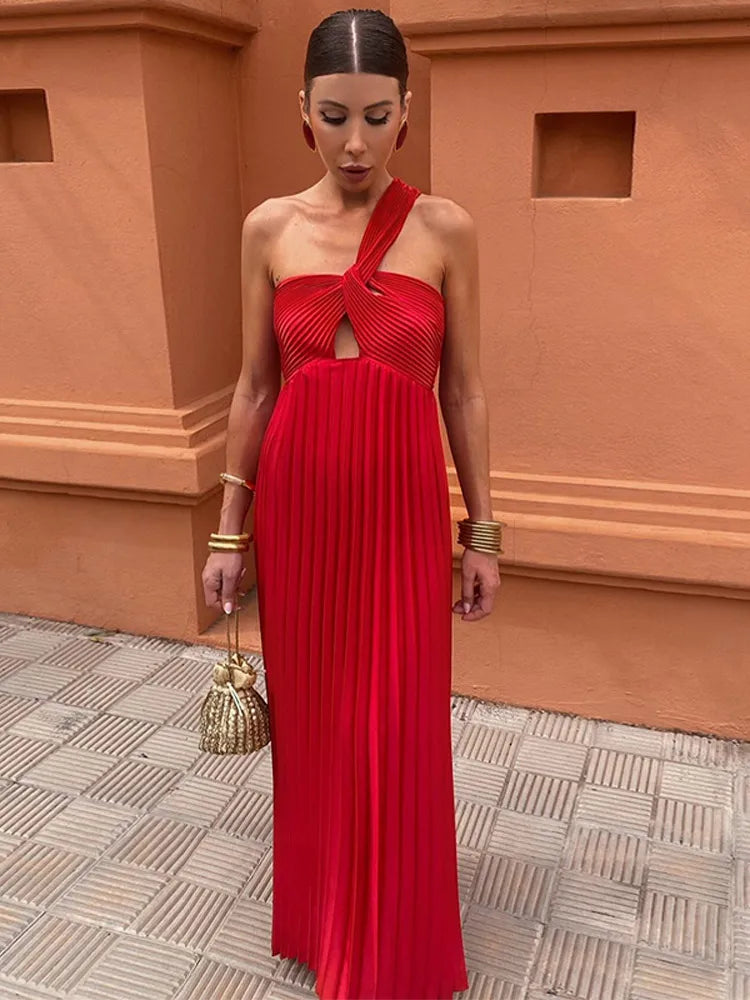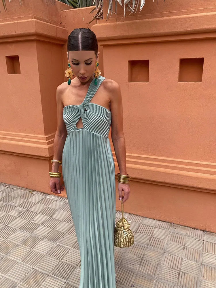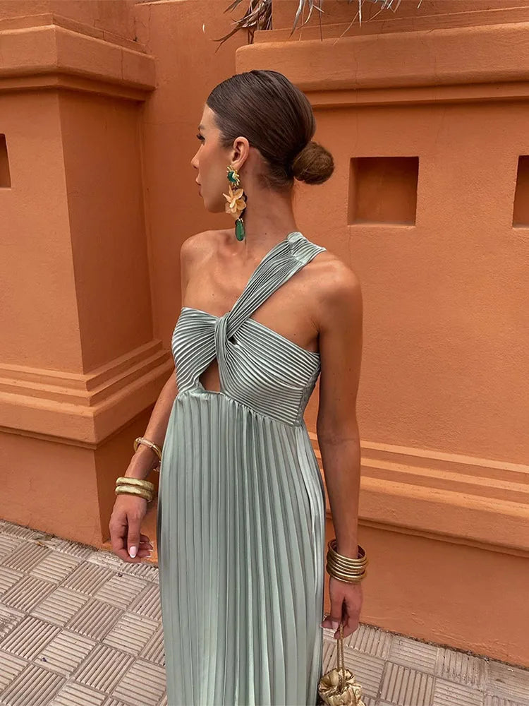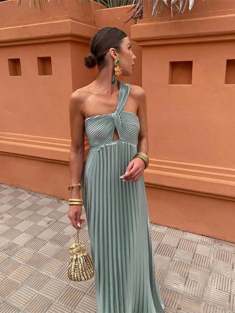 Diagonal Shoulder Pleated Evening Long Dress