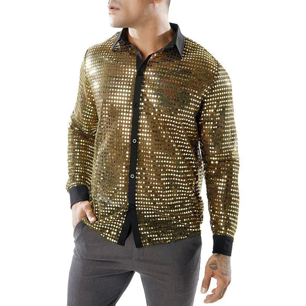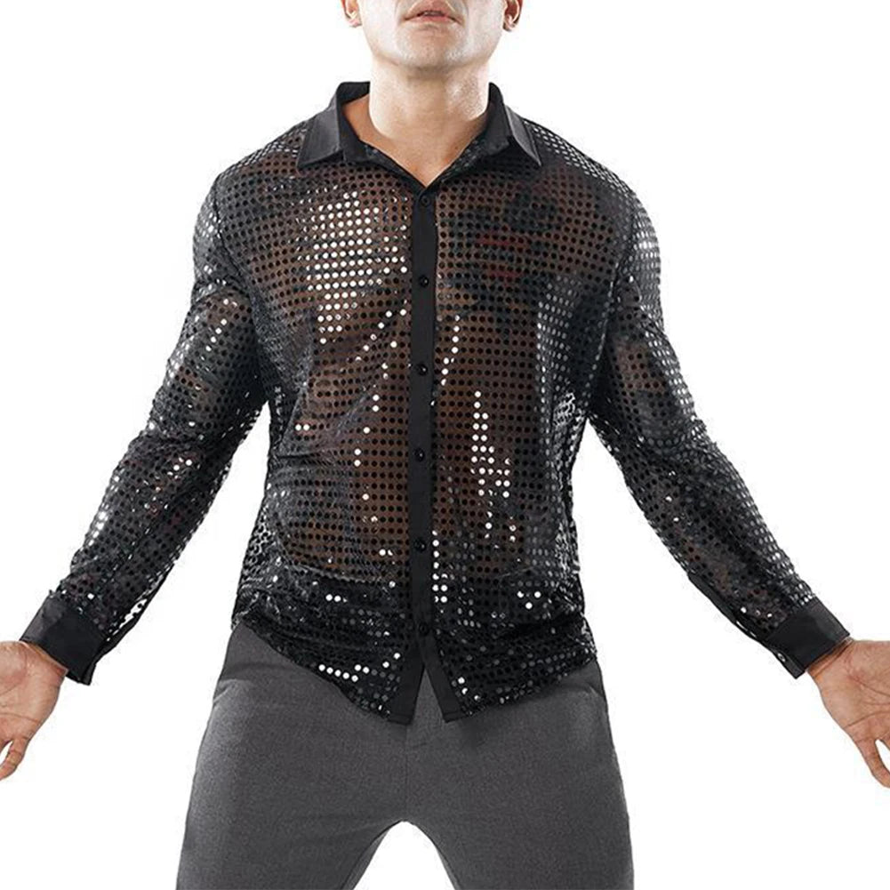 Men's Shiny Party Dance Retro 70s Disco Nightclub Shirt Sequins Top