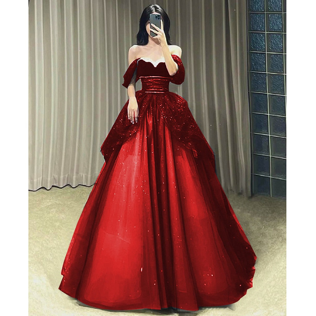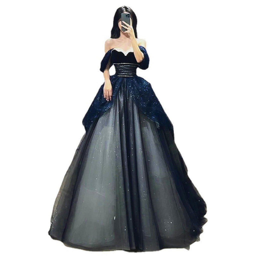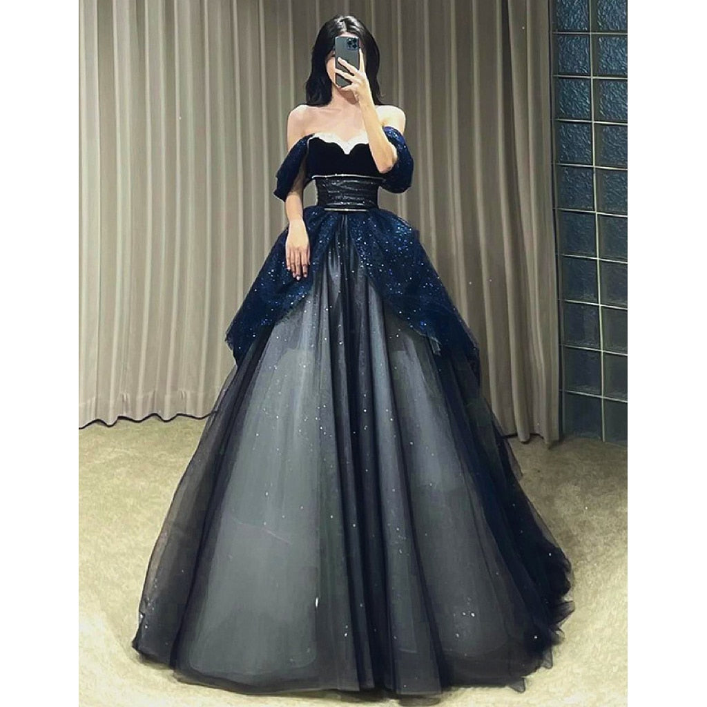 Navy Blue Evening Dress Sequined Empire Off Shoulder Tulle Wedding Party Prom Gowns