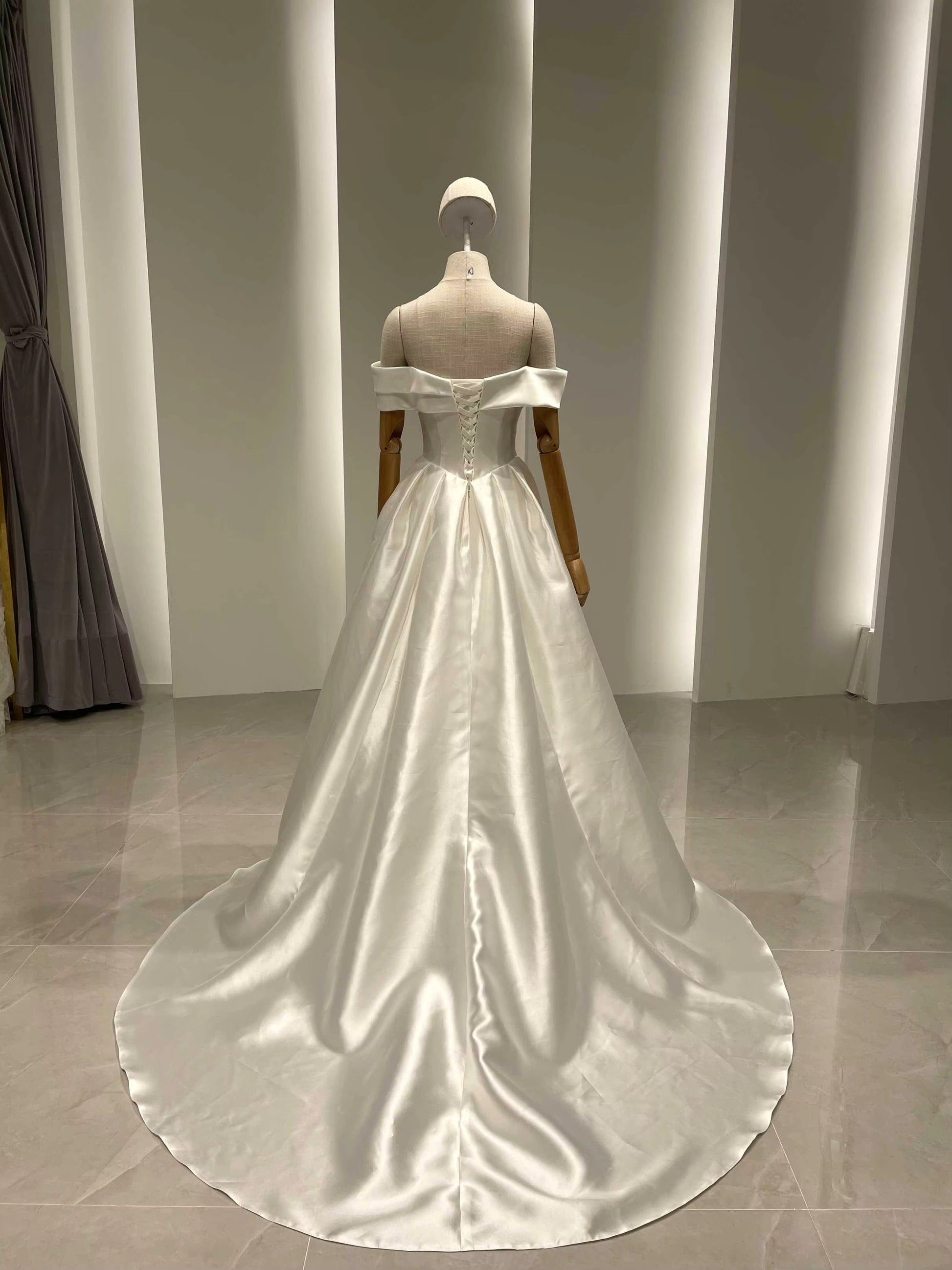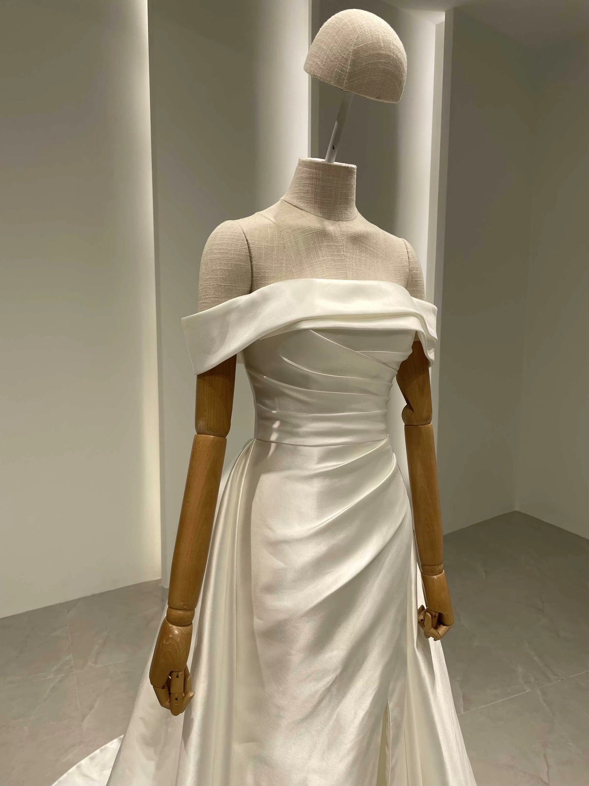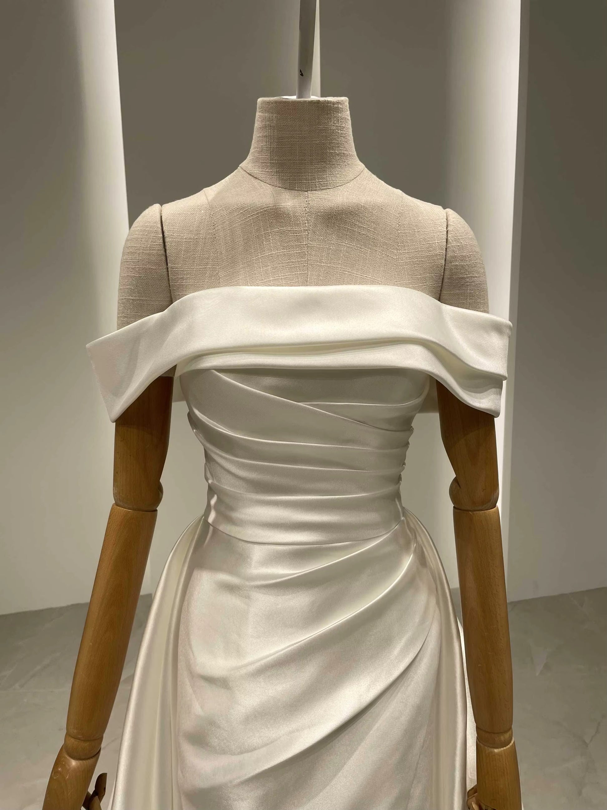 Off Shoulder Pleated Wedding Dress Satin A-line Wedding Dress With Train Bridal Gown