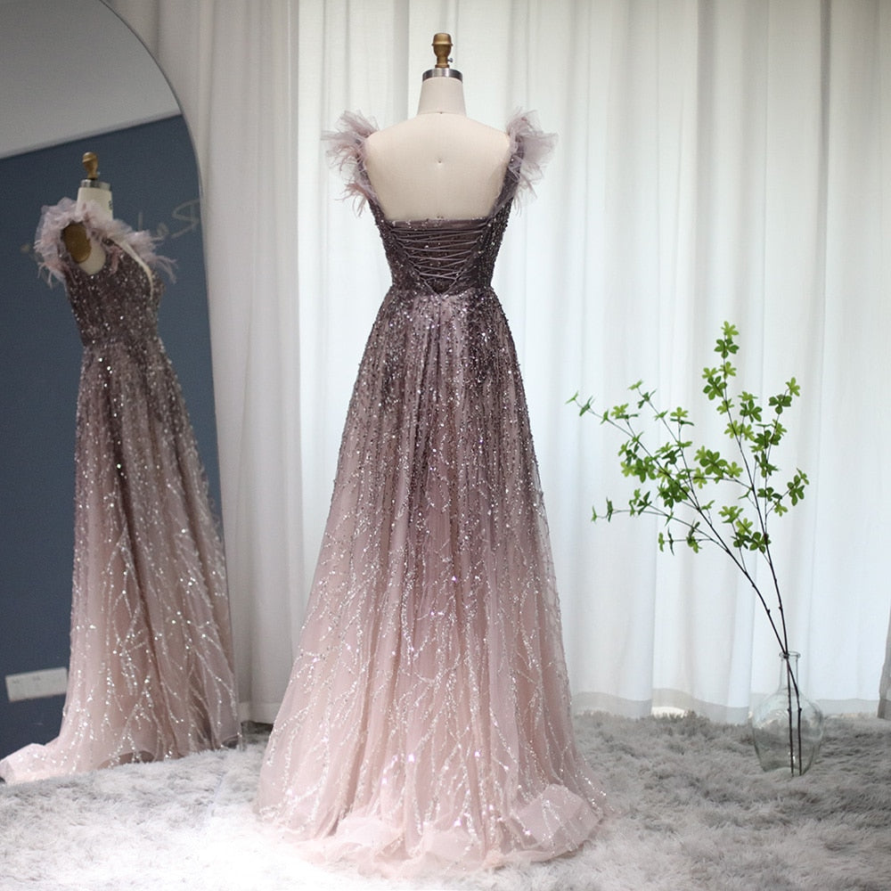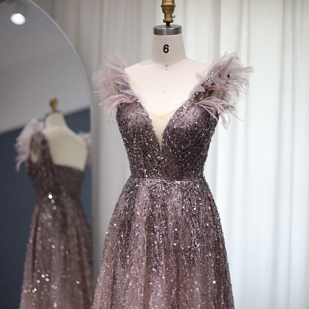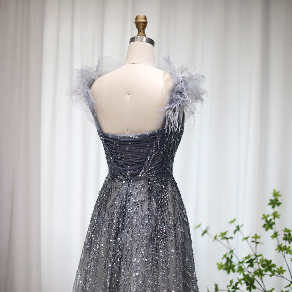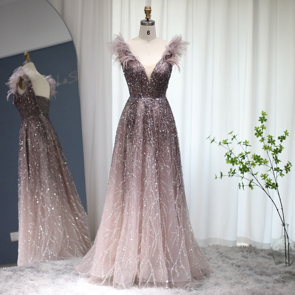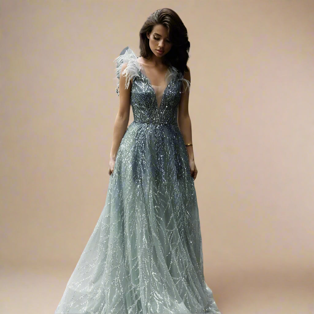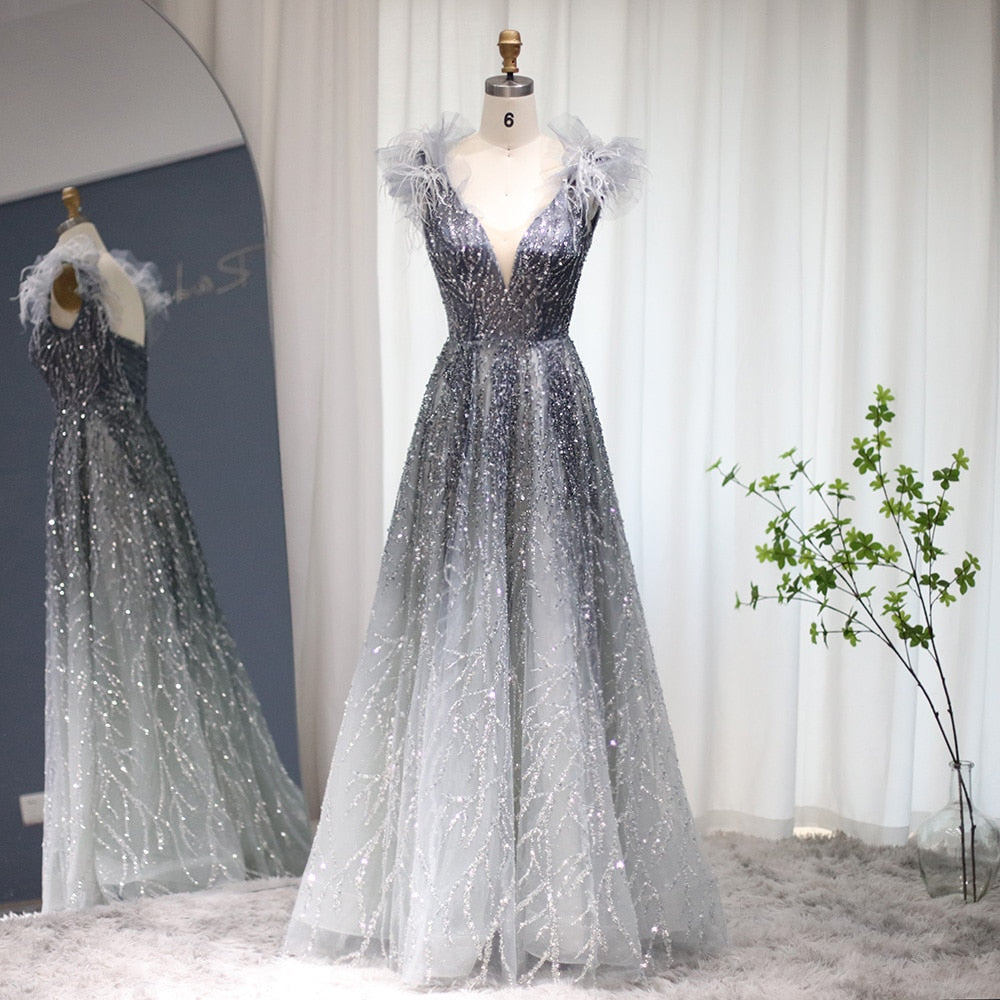 Sexy V-Neck Beaded Blue Long Formal Party Gowns For Women Wedding Bridesmaid Dress