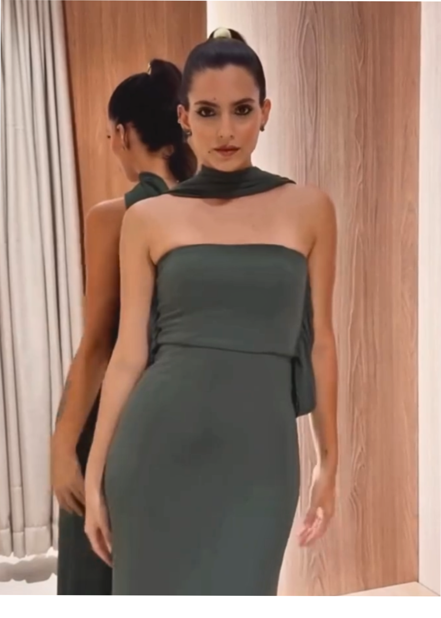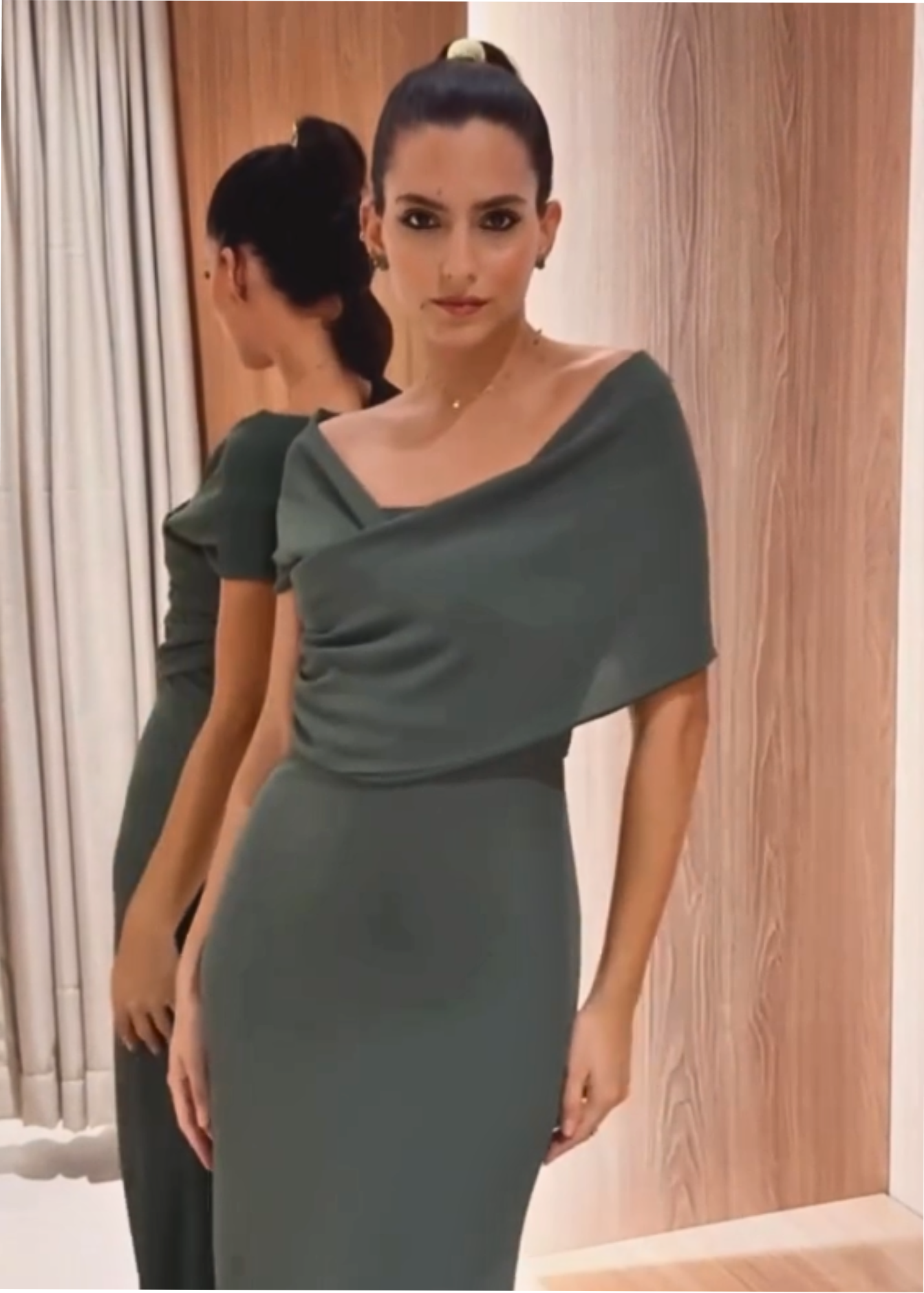 The swifty dress is a chic and versatile piece designed with elegant simplicity and multiple styling options. It features a sleek, fitted silhouette that hugs the body in a graceful, form-fitting manner. The standout feature is the adjustable top, which can be styled in several ways from a scarf draped neckline and strapless look, to an off shoulder bodice wrap, to a one- shoulder drape. Multiple styling options that will bring out different moods out of one dress.