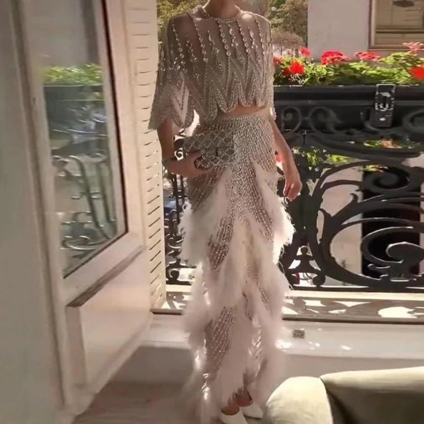 Two Pieces Evening Dresses Beaded Midi Prom Party Gowns