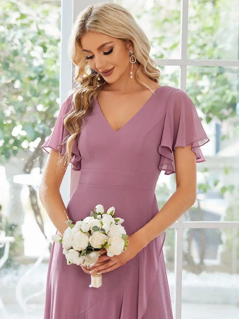V Neck High Low Ruffles A-line Chiffon Dress