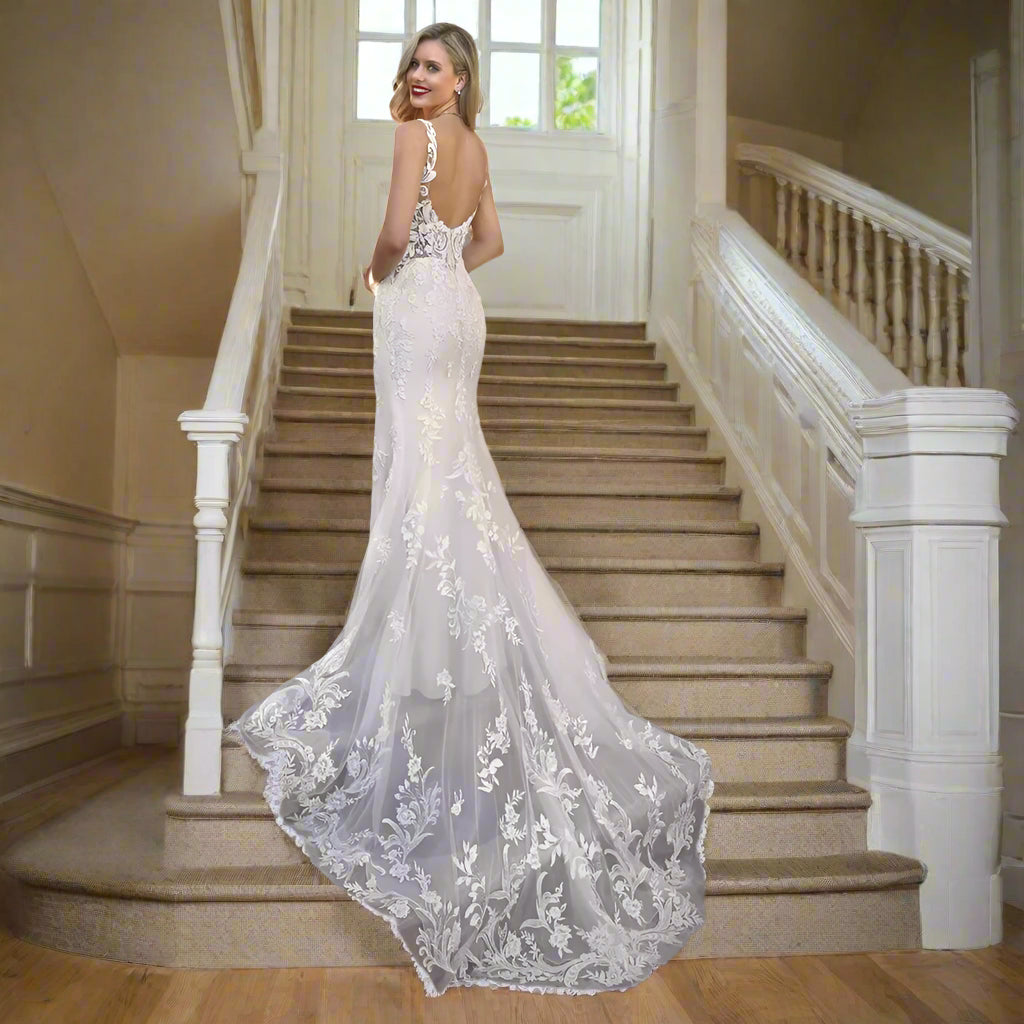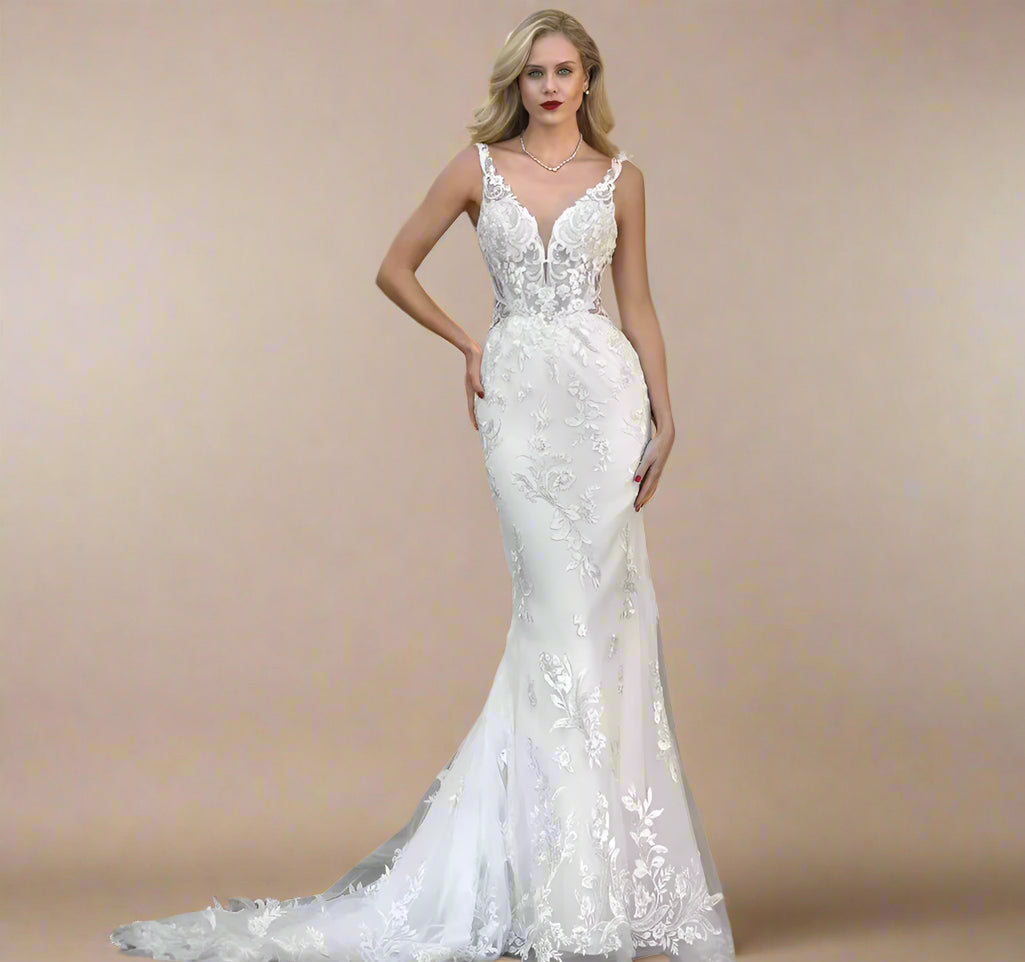 V Neck Mermaid Wedding Dress Lace Appliques Bride Dress