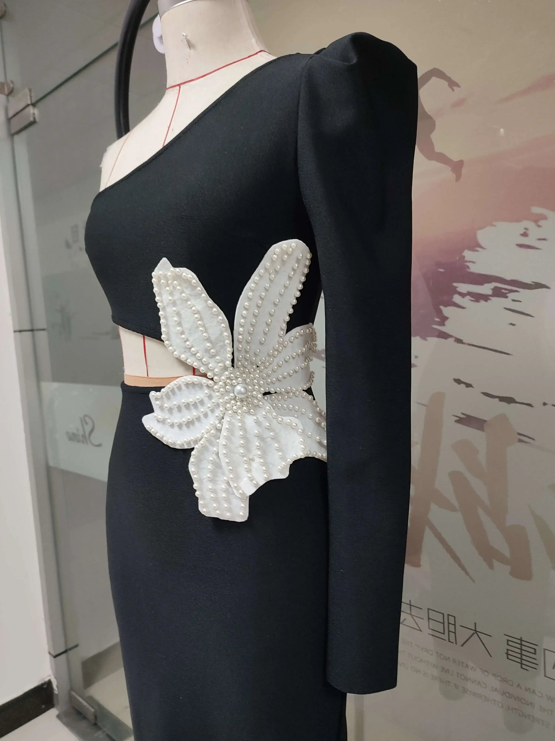 Women's Sexy One Shoulder Long Sleeve Hollow Out Flower Bandage Midi Dress Bodycon Celebrity Party Evening Dress